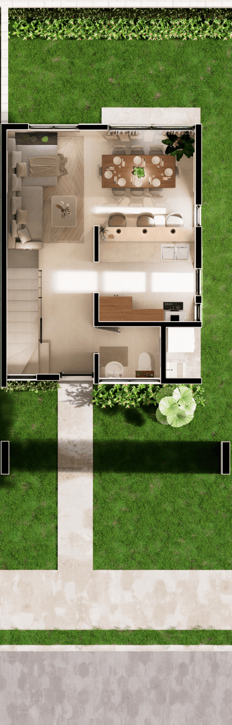Casa habitación con 120 mts2, sala, comedor, cocina, 3 recámaras, 2 ½ baños, área de lavado techada, pasillo lateral de servicio, recibidor, estacionamiento para dos autos y patio jardín.